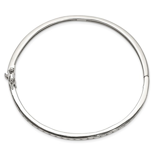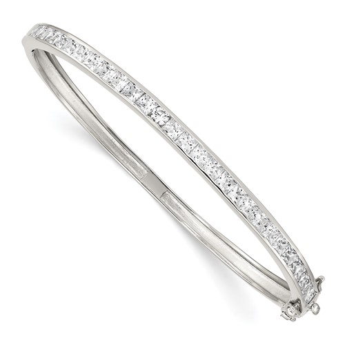 Sterling silver hinged bangle bracelet is decorated with round cubic zirconia accents. Bracelet length: 8in, width: 5mm. Weight: 15.0 grams. Safety bar and box catch. Import.