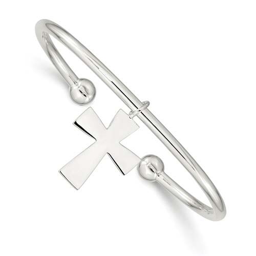 Sterling silver cuff bangle bracelet has a dangling cross charm. Cross measures 7/8 inch tall by 3/4 inch wide. One size fits most. Weight: 7 grams. Import.