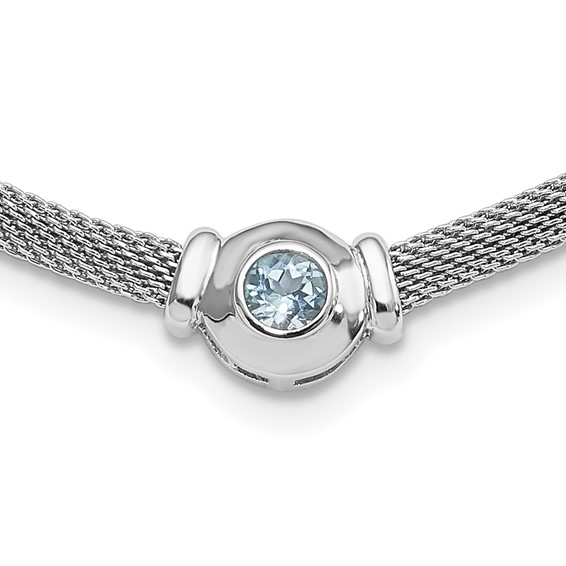Polished, hollow sterling silver mesh necklace. 1 x 5mm round genuine blue topaz. Length: 16in. Weight: 11.3 grams. Fancy lobster clasp. Made in the USA.