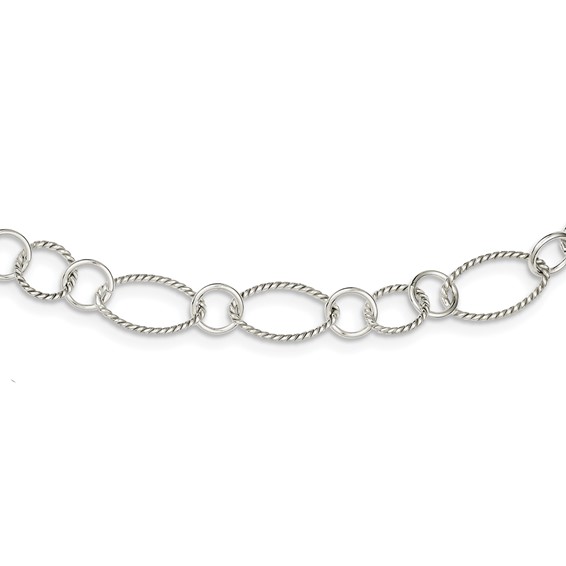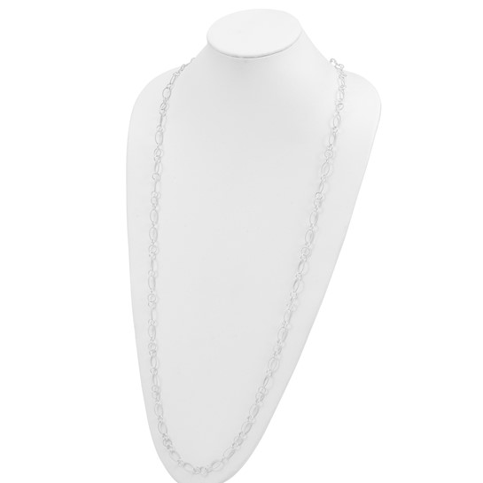 42 inch sterling silver link necklace has a lobster clasp. Braided oval links and polished round links. Import. Weight: 25.87 grams.