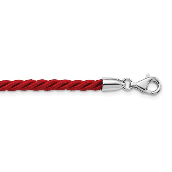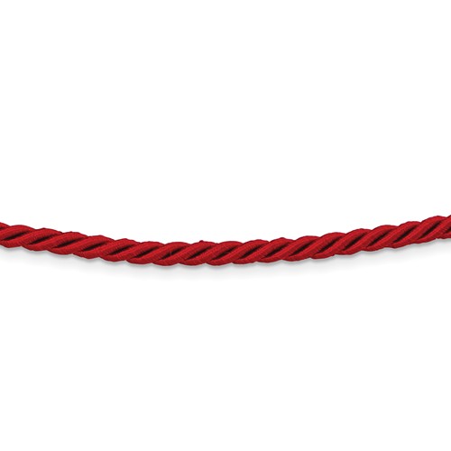 16 inch length red satin cord necklace has a sterling silver spring ring clasp. Weight: 3.4 grams. Made in Italy.