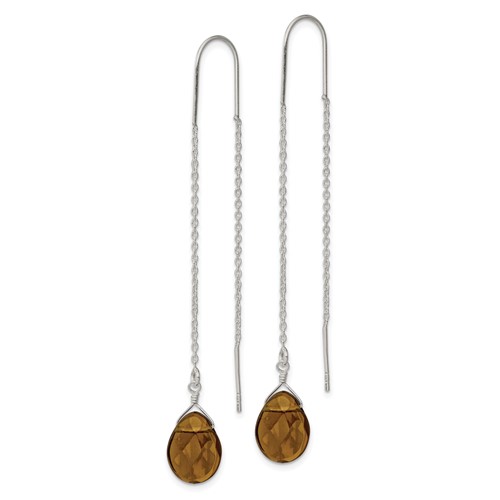Smoky crystal teardrop threader earrings are made of sterling silver. Measures 3 inches tall. Weight: 1.37 grams.