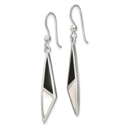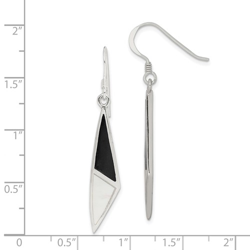 Sterling silver triangle dangle earrings are made of onyx and mother of pearl. Measures 1 7/8 inches tall. Weight: 3.4 grams. Made in USA.