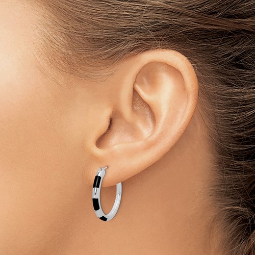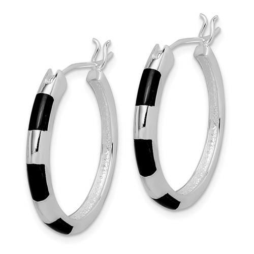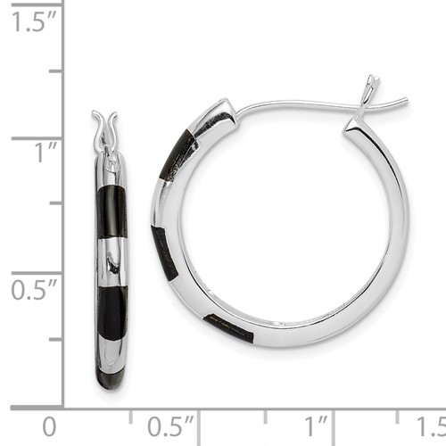 Genuine onyx inlay round hoop earrings are made of polished sterling silver with rhodium plating. Item size: 15/16 inches tall. Weight: 4.59 grams. Wire and clutch closure. Import.