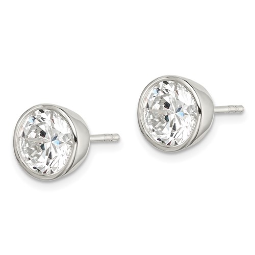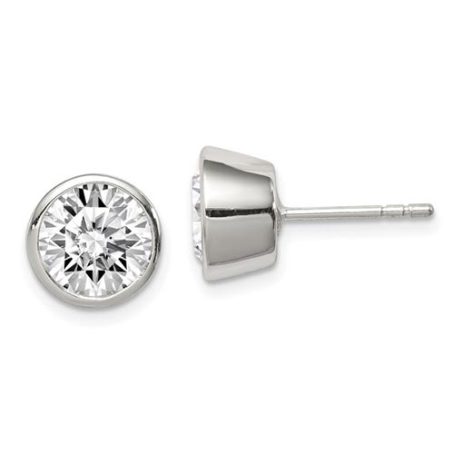 8mm cubic zirconia round bezel stud earrings are made of sterling silver. Posts with push on / pull off backs. Weight: 2.75 grams. Made in Thailand. Ships from USA.