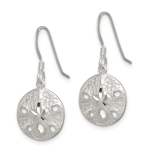 Sand dollar dangle earrings are made of polished sterling silver. Earring length: 1 1/4 in. Sand dollar size: 1/2in x 1/2in. Weight: 2.5 grams.