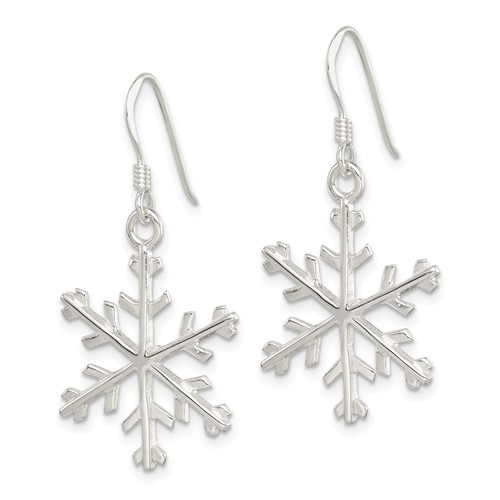 Snowflake dangle earrings are of polished solid sterling silver. French wire. Approximate weight: 3.4 grams. Measures 1 5/8 inch tall. Made in Thailand. Ships from USA.