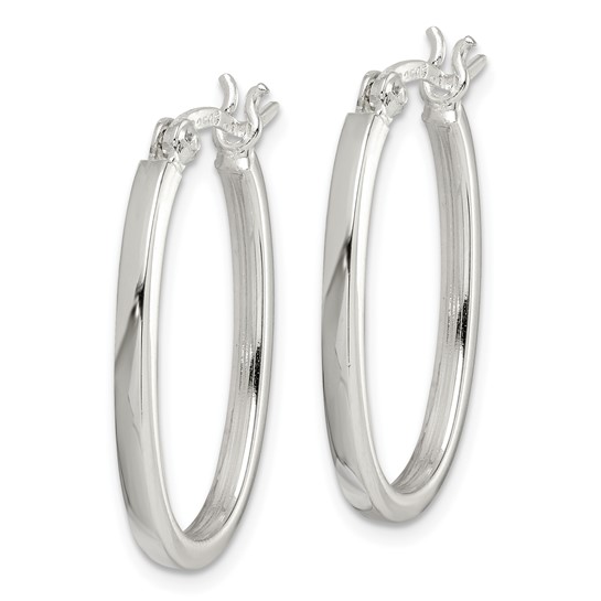 Sterling silver oval hoop earrings have a square profile. Measures 1 inch tall. Thickness: 2mm. Weight: 1.25 grams. Import.