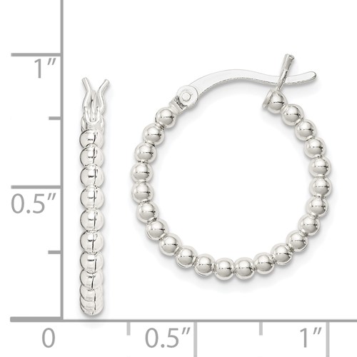 Sterling silver beaded hoop earrings have a polished finish. Measures 15/16 inch tall. Hollow. Weight: 2.2 grams. Made in India.