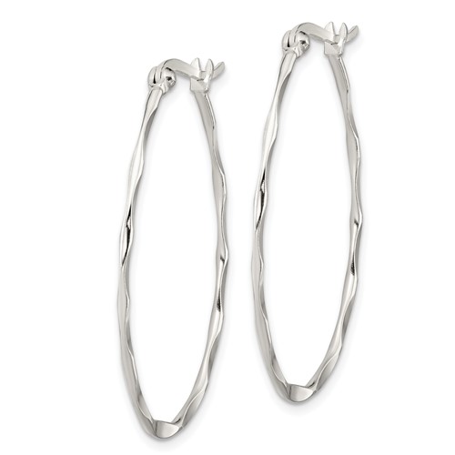 Twisted oval hoop earrings are made of polished sterling silver. Hollow. Measures 1 1/2 inches tall. Weight: 2 grams.