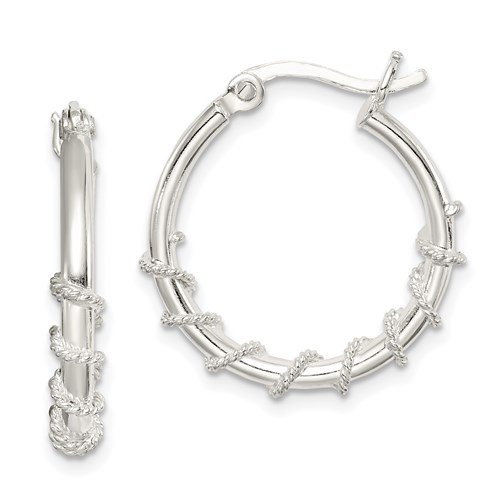 Sterling Silver Wrapped Hoop Earrings. Weight: 1.37 grams. Measures 13/16 inch tall. This item is slightly larger than a penny.