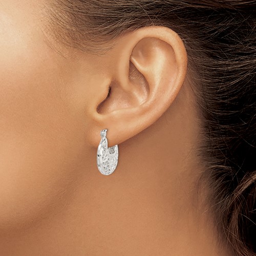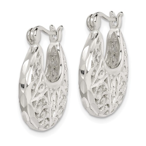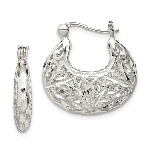 Fancy filigree hoop earrings are made of polished sterling silver. Measures 1 inch tall by 13/16 inches wide. Wire and clutch closure. Weight: 5.9 grams. Import.