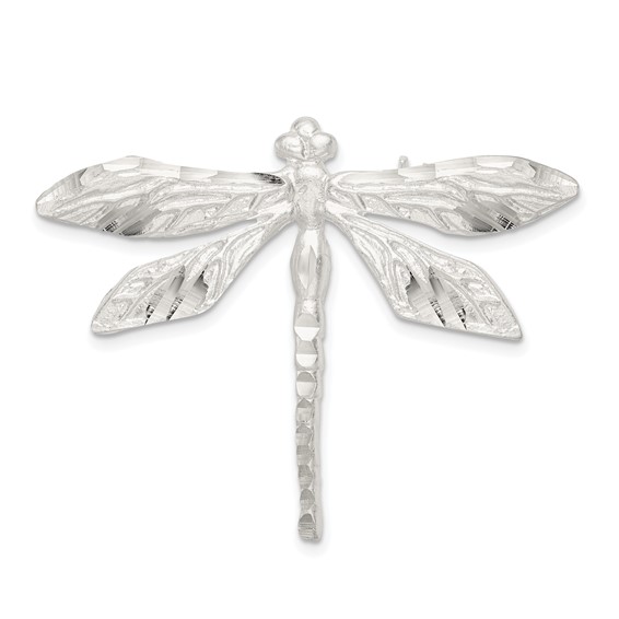 Satin finish diamond cut dragonfly pin is made of sterling silver. Weight: 4.9 grams. Measures 1 3/8 inches tall by 1 3/4 inches wide without bail.
