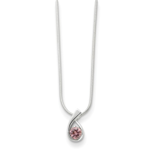 Sterling silver pink cubic zirconia pendant dangles from an 18in snake chain. Weight: 5.8 grams. Measures 5/8 inches tall by 1/4 inches wide.