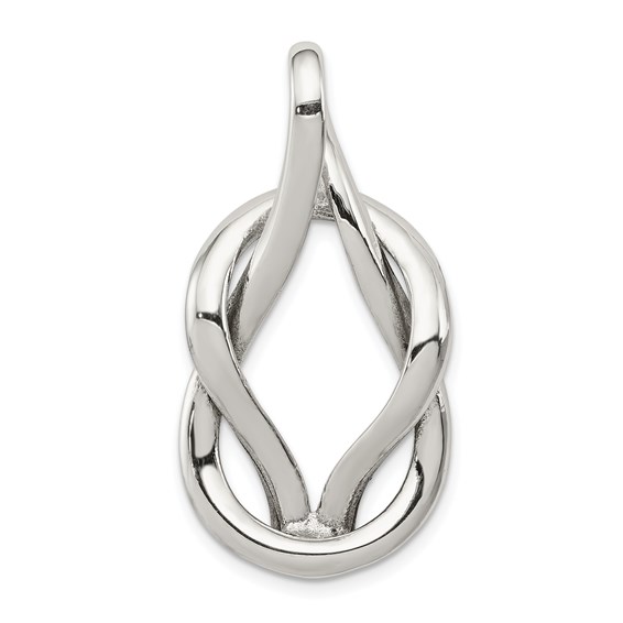 This polished fancy knot slide is made of solid sterling silver. Approximate weight: 6.5 grams. Measures 1 3/8 inches tall by 3/4 inches wide. Fits up to 6mm chain.