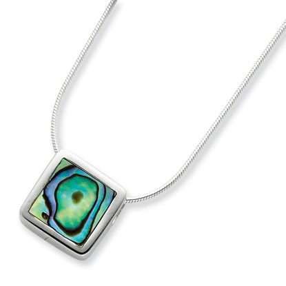 Sterling silver abalone pendant has a 16in chain. Pendant size: 1/2 inch tall by 1/2 inch wide. Weight: 5.5 grams. Springlock clasp.