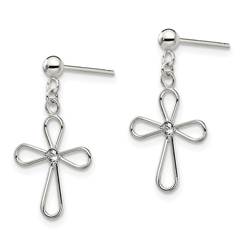 Sterling silver cross earrings feature cubic zirconia accents. Post backs. Measures 3/4 inches tall by 5/16 inch wide. Imported.