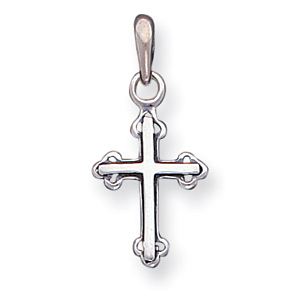 Antiqued petite double cross charm is made of sterling silver. Measures 3/4 inches tall by 1/2 inches wide without bail. Flat back. This item is slightly larger than a penny. Weight: 1.2 grams.