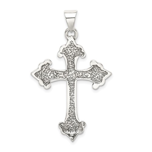 This men's cross pendant has budded tips and is made of antiqued sterling silver. Measures 1 3/8 inches tall by 1 1/16 inches wide without bail. Chain not included. Fits up to a 4mm wide chain. Weight: 3.9 grams.