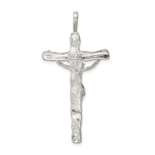 This jumbo crucifix pendant is made of polished sterling silver. Measures 1 7/8in by 15/16in. Bail dimensions: 6mm x 3.5mm. Weight: 5.69 grams.