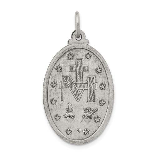 Die struck, oval miraculous medal is made of antiqued sterling silver. Measures 1 inch tall by 11/16 inch wide without bail. The back of the medal features an M, surmounted by a cross, with 2 hearts and 12 stars. Made in the USA.