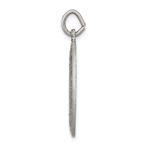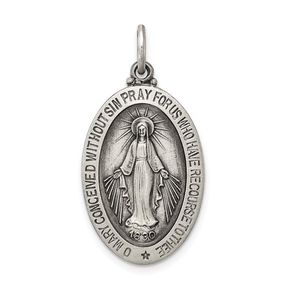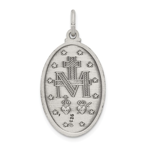 Oval miraculous medal is made of solid sterling silver. This die struck medal is exquisitely detailed. Dimensions: 15/16 inch tall by 5/8 inch wide without bail. This item is slightly smaller than a quarter. Fits up to a 2.5mm wide chain. The back of medal features an M, surmounted by a cross, with two hearts and 12 stars. Made in USA.