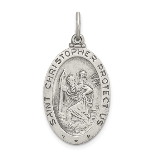 This oval St. Christopher medal for soccer players is made of sterling silver. Measures 1 inch tall by 5/8 inch wide without bail. This item is slightly smaller than a quarter. Chain not included. Weight: 2.47 grams.