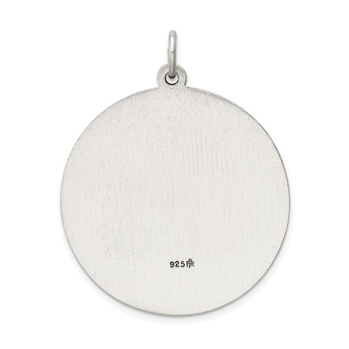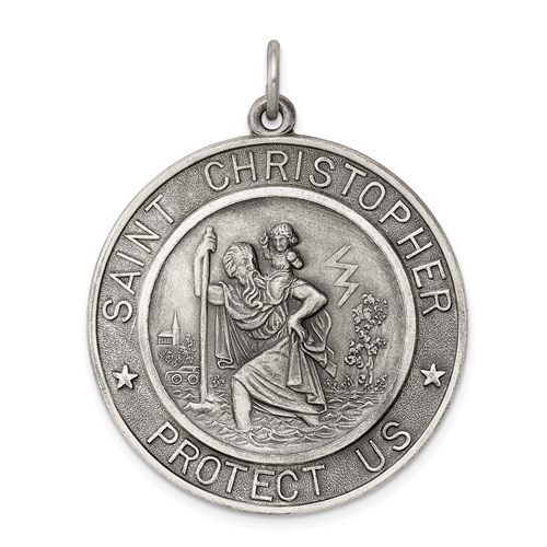 Antiqued sterling silver St. Christopher medal is die struck. Measures 1 1/4 inch tall by 1 1/4 inch wide without bail. This item is larger than a quarter. Fits up to a 3mm wide chain. Weight: 9.72 grams. Made in USA.