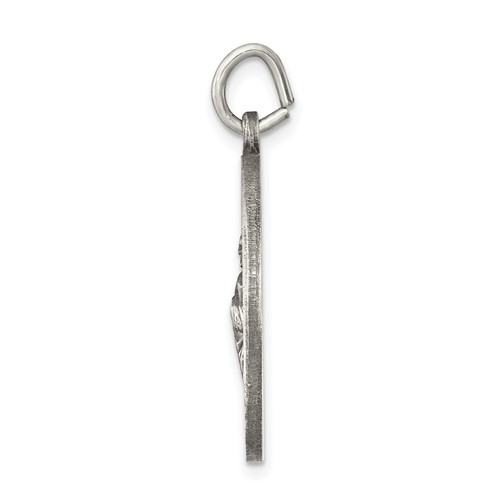This round St. Jude Thaddeus medal is made of sterling silver. Satin finish with black antiquing. Item size: 7/8in x 7/8in without bail. This item is the size of a nickel. Weight: 4.23 grams. Chain not included. Made in the USA.
