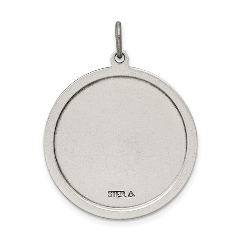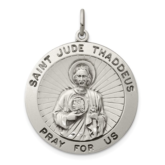 Round St Jude Thaddeus medal is made of solid sterling silver. Item measures 1 inch tall by 1 inch wide without bail. Weight: 7.8 grams. This item is slightly larger than a quarter. Diamond cut. Fits up to a 2.5mm wide chain. Made in the USA.