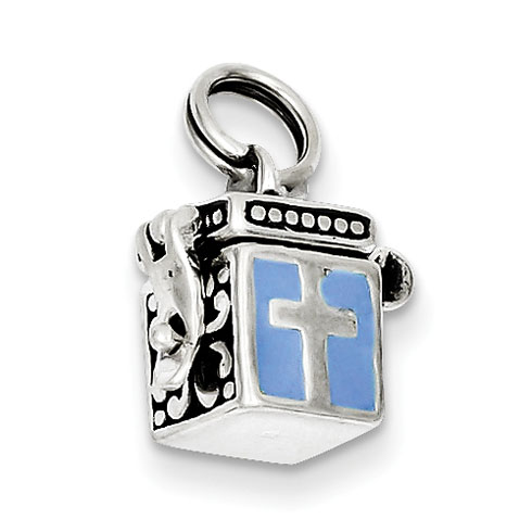 Blue enameled cross box charm is made of antiqued sterling silver. Weight: 3.2 grams. Item measures 3/8 inch tall by 1/4 inch wide without bail.