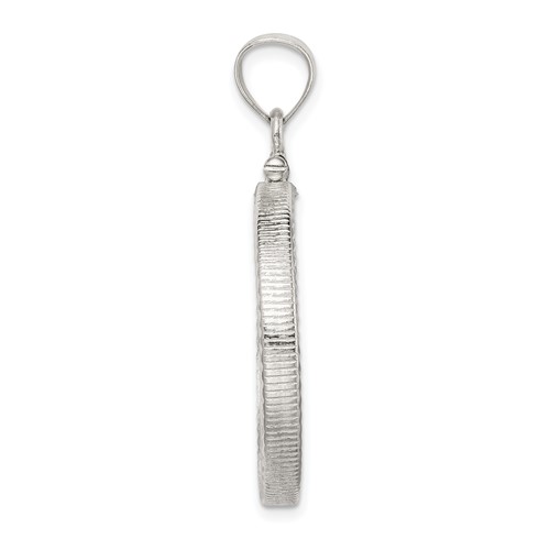 Susan B. Anthony diamond-cut coin bezel pendant is made of sterling silver. Dimensions: 26.4mm x 1.8mm. Weight: 1.25 grams. Made in USA.
