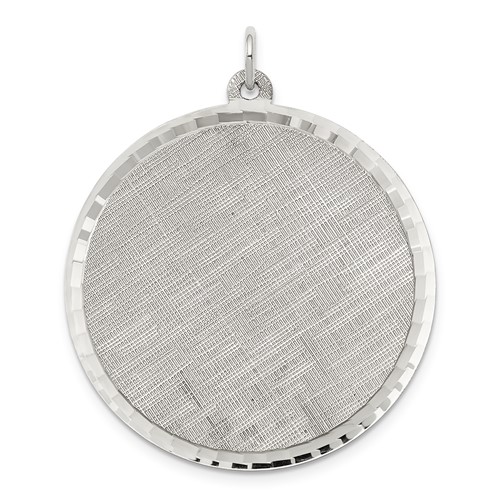 Sterling silver engravable round pendant has a diamond-cut texture and patterned border. Item measures 1 1/4 inches tall by 1 1/4 inches wide without bail. Weight: 6.15 grams.