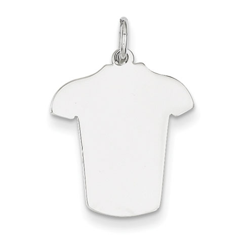 Engravable T-shirt charm is made of polished sterling silver. Item measures 3/4 inch tall by 5/8 inch wide without bail. Weight: 1.87 grams. Made in the USA.