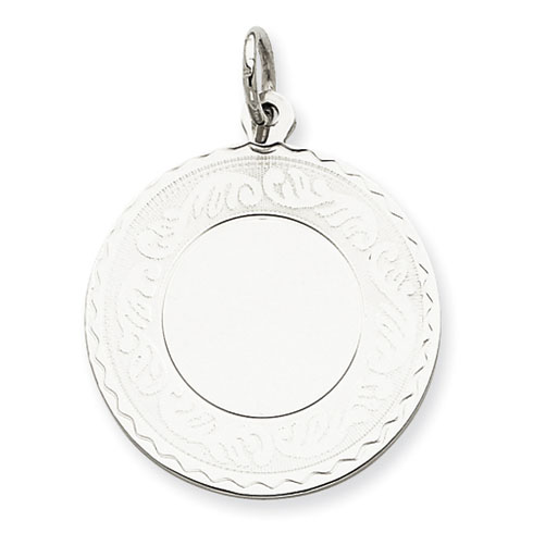 Sterling Silver Engravable Round with Scroll Disc Charm. Weight:3.99 grams. Item measures 1 inch tall by 1 inch wide without bail.