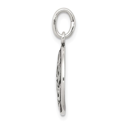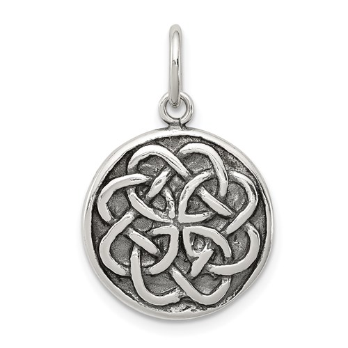 This small round antiqued Celtic knot charm is made of solid sterling silver. Item measures 11/16 inch tall by 5/8 inch wide without bail. Weight: 1.3 grams.