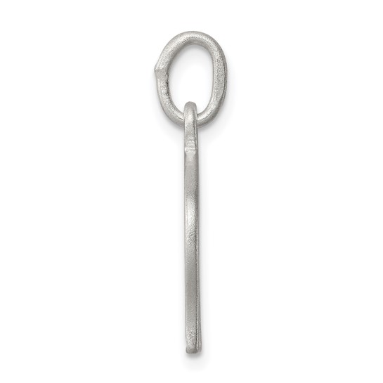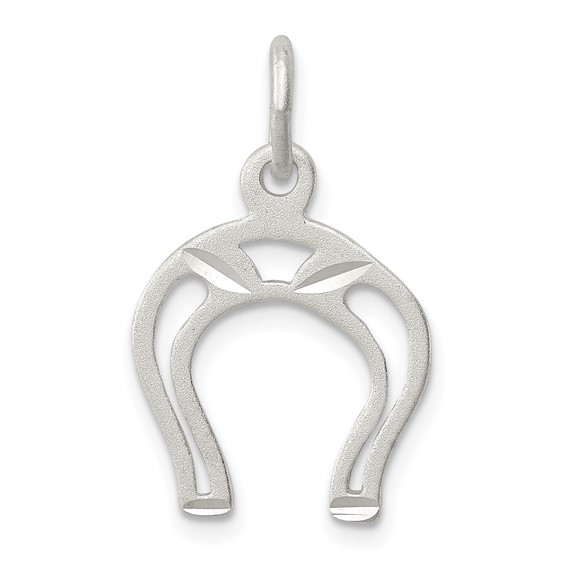 Open style horseshoe charm is made of sterling silver with a matte satin finish. Item size: 5/8 inch tall by 1/2 inch wide without bail. Weight: 0.8 grams. Jump ring fits up to a 3mm wide chain. Import.