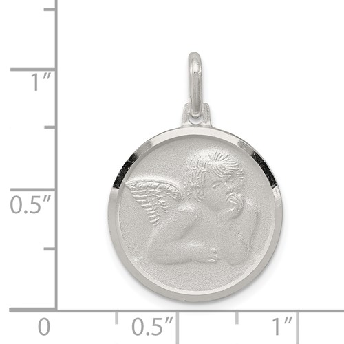 This round sterling silver angel charm has a polished and satin finish. Item measures 3/4 inches tall by 3/4 inch wide without bail. Chain not included. Approximate weight: 3 grams. Made in Italy. Ships from USA.