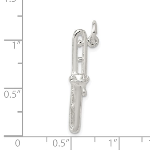 Trombone charm is made of polished sterling silver. Item dimensions: 1in tall by 1/4in wide without bail. Weight: 1.7 grams. Import.