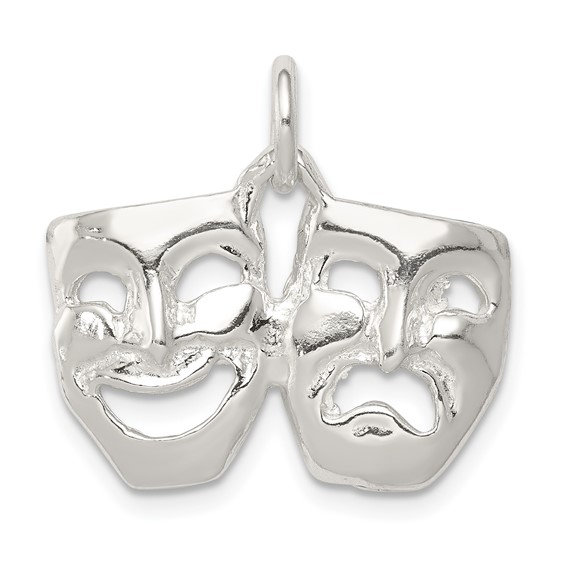 Comedy and tragedy mask charm is made of polished sterling silver. Item measures 9/16 inch tall by 7/8 inch wide without bail. Weight: 2.25 grams.