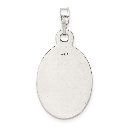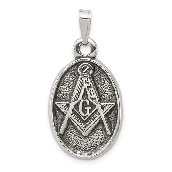 The oval masonic pendant is made of antiqued sterling silver. Antique finish. Weight: 4.19 grams. Item measures 1in x 11/16in without bail. This item is about the size of a quarter. Chain not included.