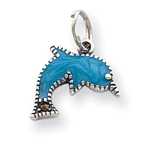 Blue enameled dolphin charm is made of sterling silver. Weight: 1.2 grams. Item measures 1/2 inch tall by 5/8 inch wide without bail. Open back. Available while supplies last.