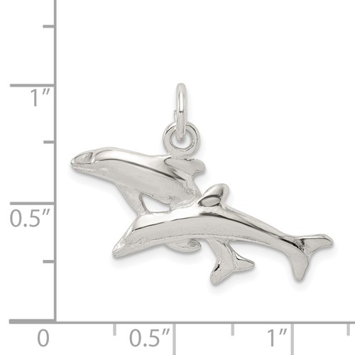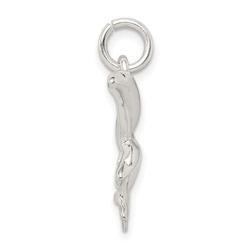 Sterling silver dashing dolphins charm has an open back. Item measures 5/8 inch tall by 1 1/8 inch wide without bail. Weight: 2.25 grams. Fits up to a 3mm wide chain. Import.