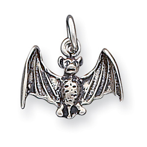 Antiqued flying bat charm is made of sterling silver. Item measures 9/16 inch tall by 3/4 inch wide without bail. Weight: 2.25 grams.