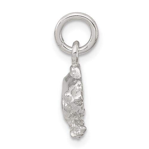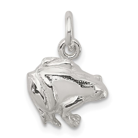 This sterling silver, petite three-dimensional frog charm has an open back. Item measures 7/16 inch tall by 1/2 inch wide without bail. Weight: 0.87 grams. Item is half the size of a quarter. Jump ring fits up to a 3mm wide chain or bracelet. Made in USA.