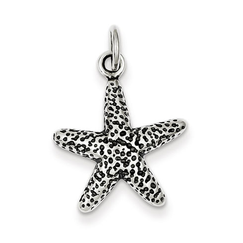 Sterling silver antiqued starfish charm has a speckled texture and open back. Weight:1.75 grams. Item measures 3/4 inch tall by 11/16 inch wide without bail. Import.