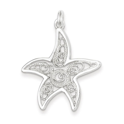 Sterling silver starfish charm has a rope like texture. Item size: 1 1/8 inch tall by 1 1/16 inch wide without bail. Weight: 2.75 grams.