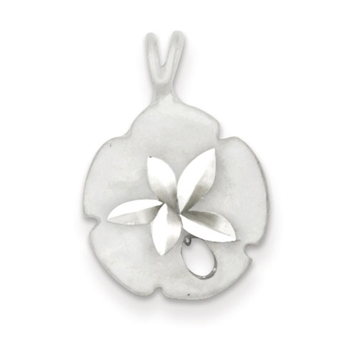Diamond-cut, satin finish sand dollar charm is made of sterling silver. Item measures 5/8 inch tall by 9/16 inch wide without bail. Weight: 1.25 grams.