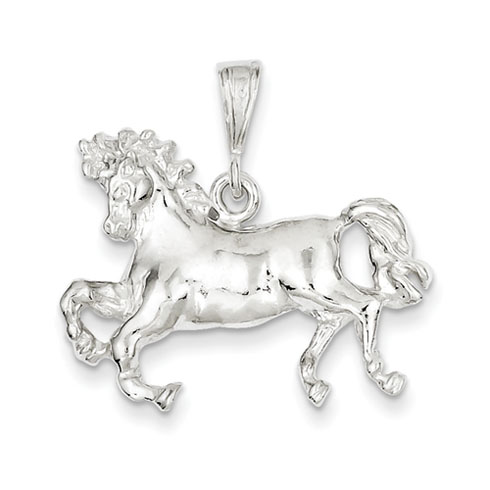Large galloping horse charm is made of polished sterling silver. Open back. Item measures 1 1/8 inch tall by 1 inch wide without bail. Weight: 3.5 grams. Made in USA.