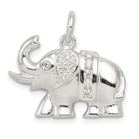 This small sterling silver elephant charm is decorated with cubic zirconias. Item measures 5/8 inch tall by 13/16 inch wide without bail. Weight: 2.25 grams.